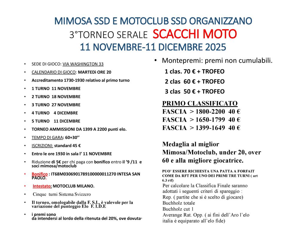 IL comitato organizzatore è composto da : Pietro Barrera ( Consigliere nazionale federale e presidente onorario Mimosa ssd) direttore del torneo. Miluska Degregori ( presidente sez scacchi Mimosa ssd). Merlini Osvaldo ( amministratore unico Mimosa ssd e direttore generale della sezione scacchi). Manuela Valletti ( giornalista). Flavia Leopardi ( famiglia Leopardi). LA NAVETTA PREVISTA PARTIRA’ […]