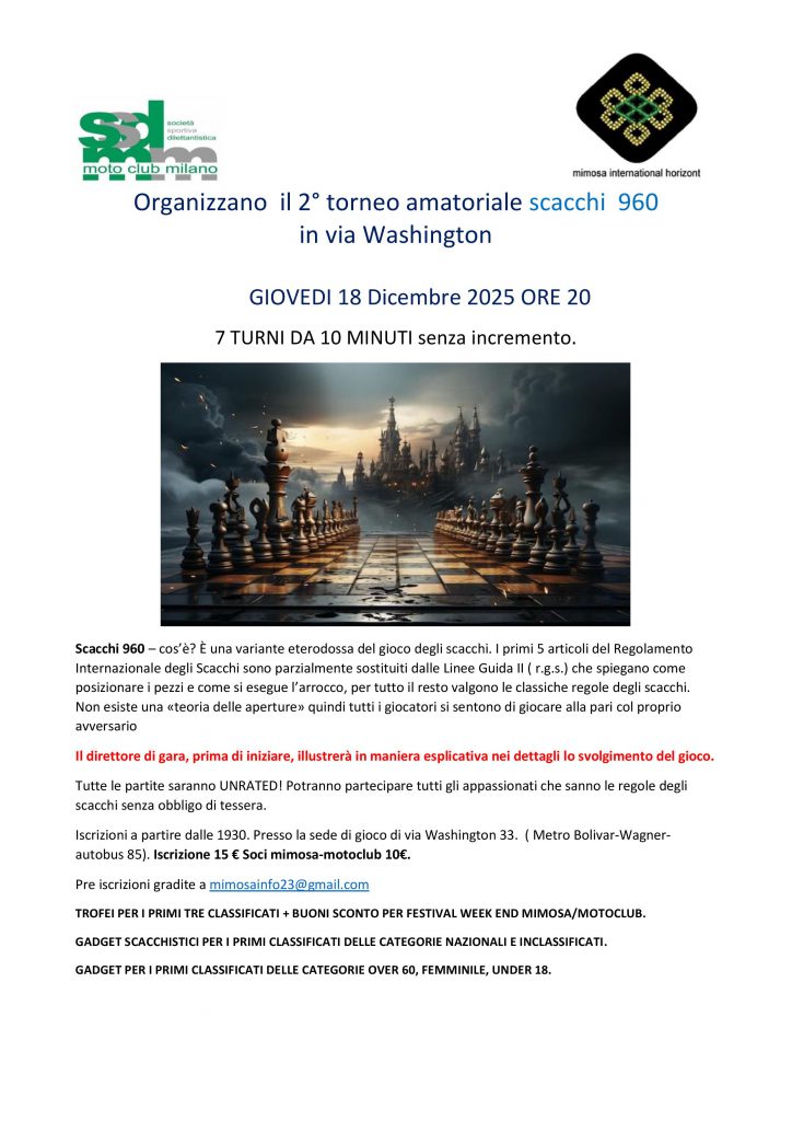 CARI AMICI SCACCHISTI APERTA LA CAMPAGNA DI RIAFFILIAZIONE E TESSERAMENTO 2026. PER TUTTI COLORO CHE HANNO CONTRIBUITO ALLE FORTUNE DEL CIRCOLO NEO CAMPIONE DELLA LOMBARDIA NELLE VARIE COMPETIZIONI E HANNO PARTECIPATO ALLE ATTIVITA’ FINO AL 20 DICEMBRE 50 EURO DOPO IL 20 DICEMBRE 60 EURO PER TUTTI GLI ALTRI 70 EURO COSTI COMPRENSIVI DELLA TESSERA […]