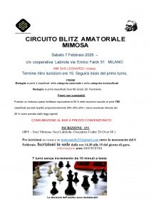 2° TORNEO CIRCUITO BLITZ MIMOSA della Labriola 7 FEBBRAIO 2026 VIA FALCK 51 MILANO ( MM san leonardo) Posted on: 31 Gennaio 2026, by : Mimosa International