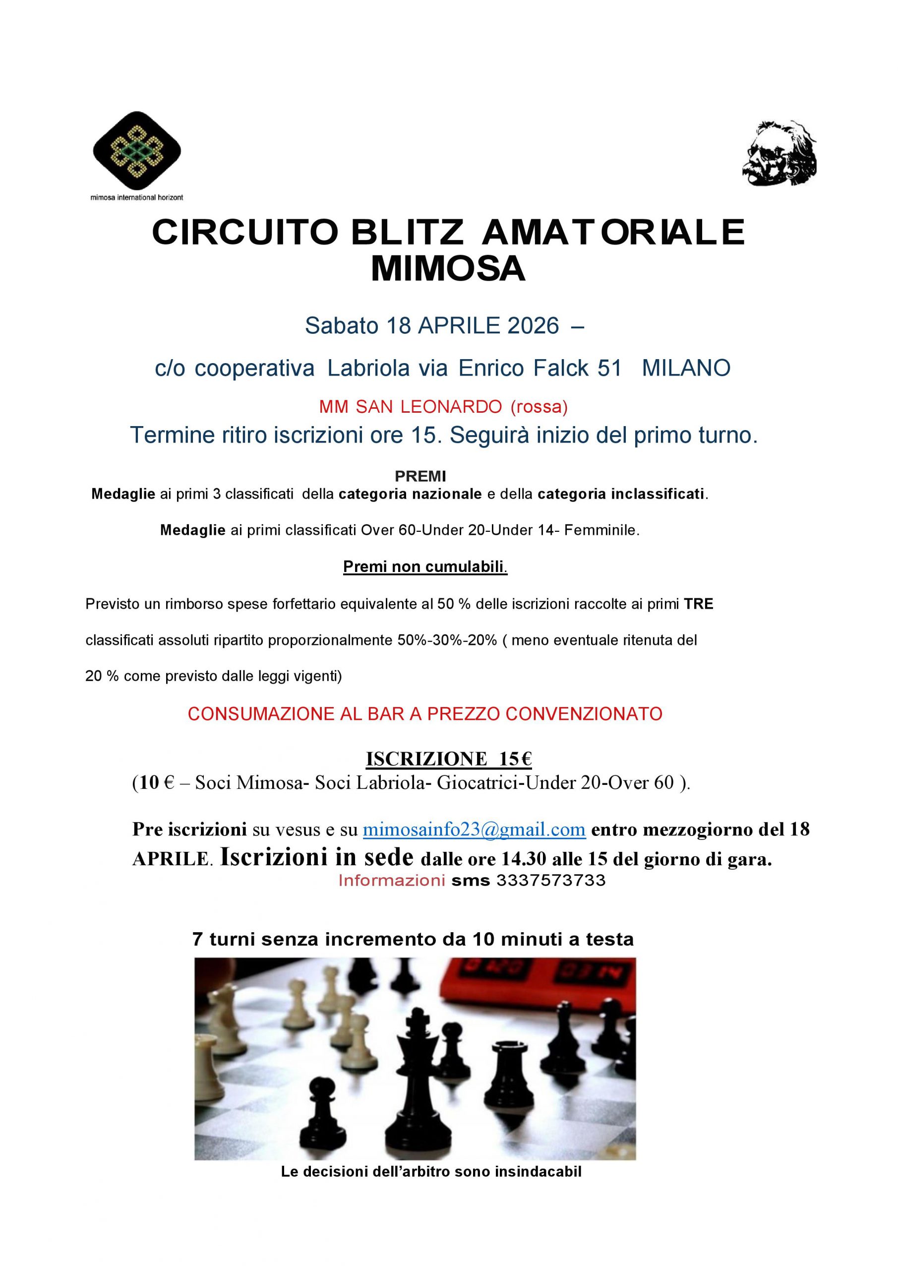 18 APRILE 2026 4° TORNEO CIRCUITO MIMOSA c/o cooperativa labriola via Falck 51 Milano Posted on: 1 Aprile 2026, by : Mimosa International